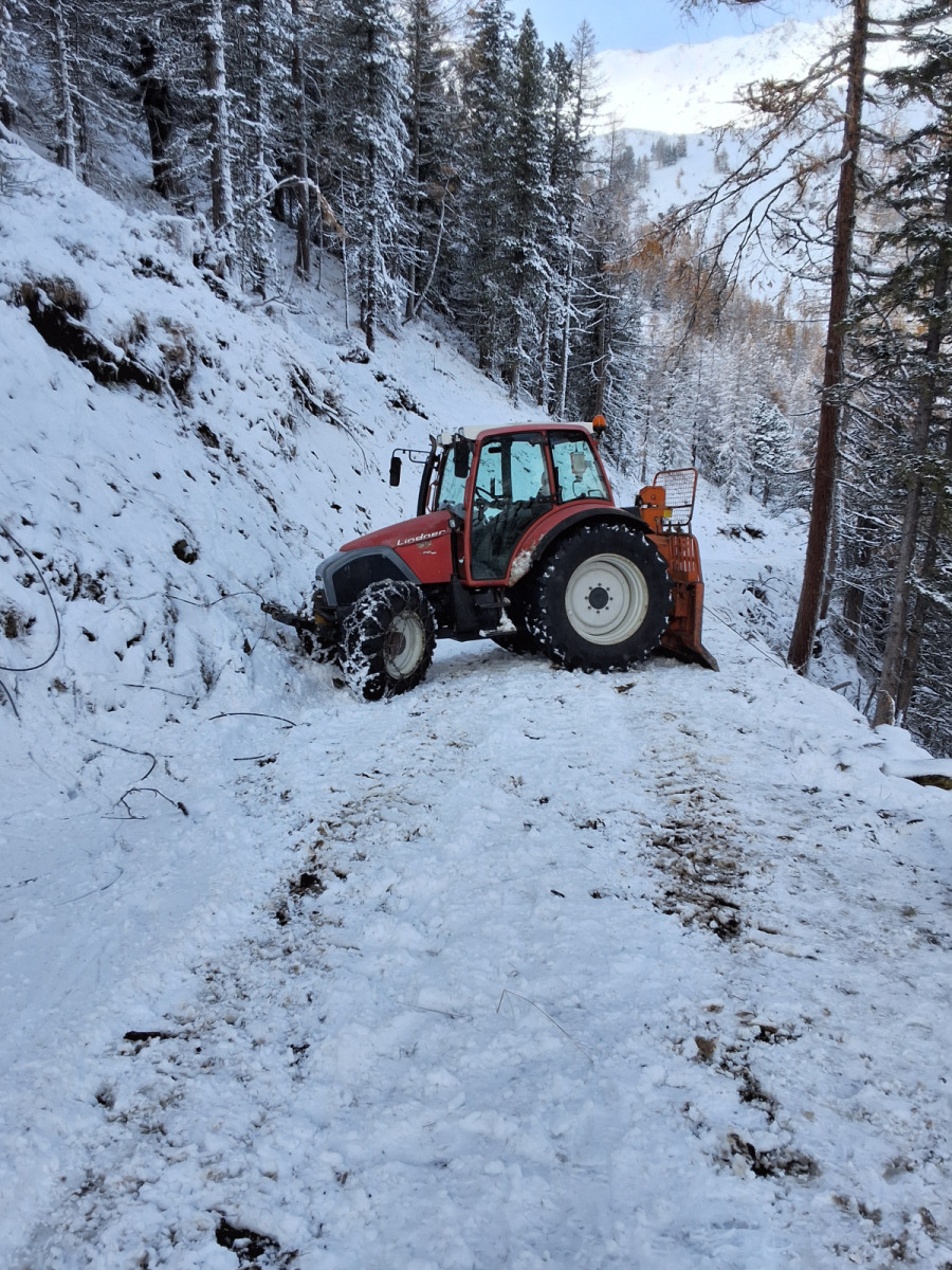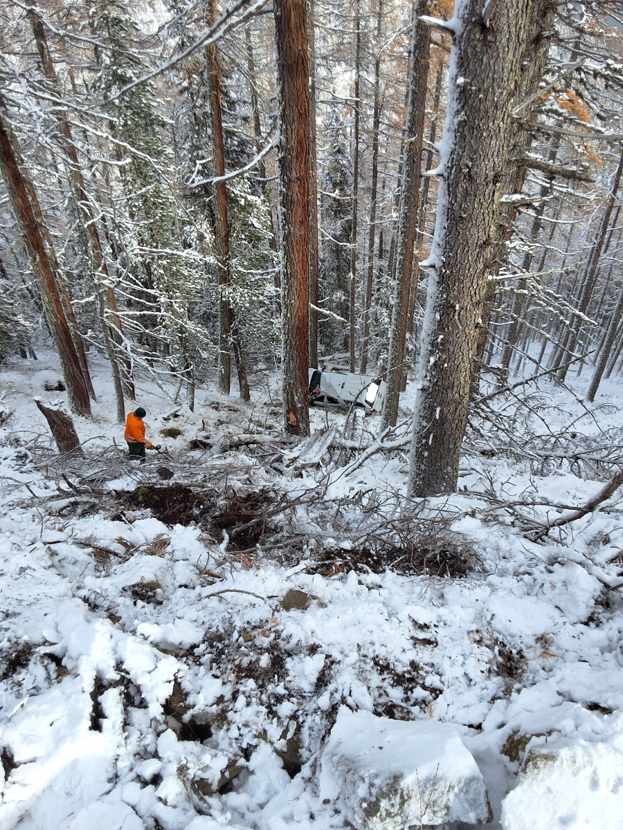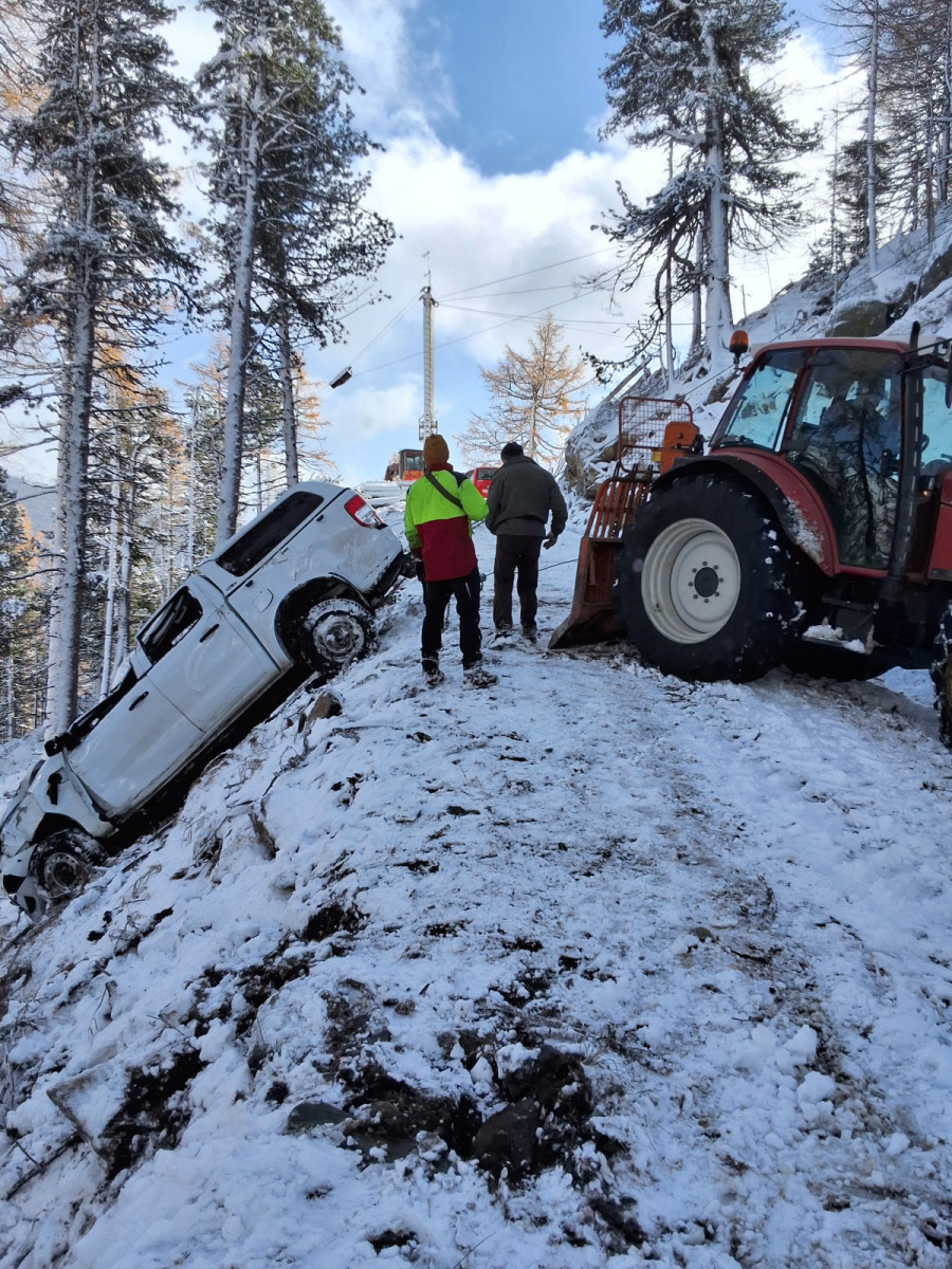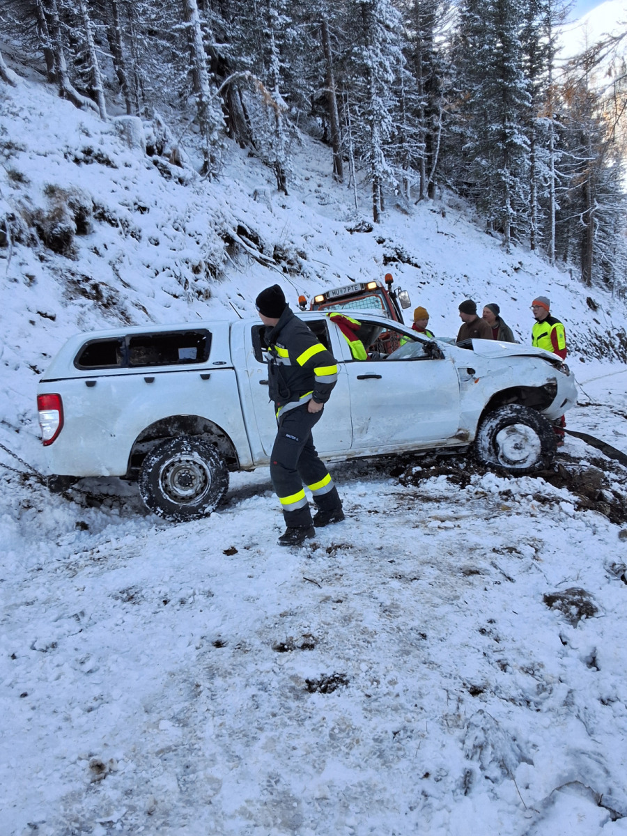 Ein Fahrzeug ist von einem Forstweg abgekommen und über eine steile Böschung gestürzt. Durch die winterlichen Verhältnisse mussten am MTF-A Ketten angelegt werden.