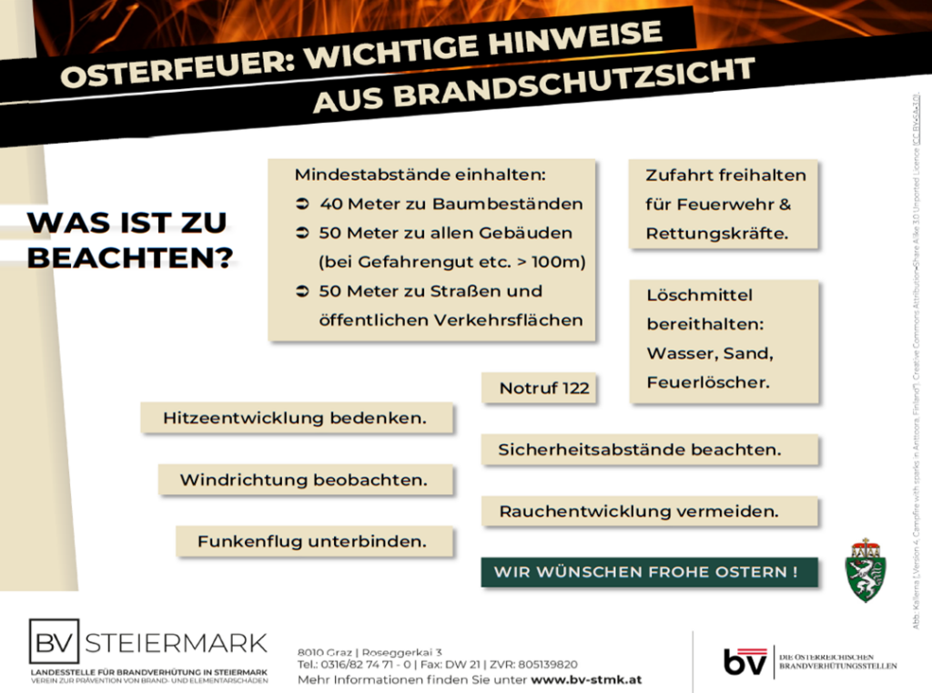 Osterfeuer dürfen nur von Karsamstag 15.00 Uhr, bis Ostersonntag 03.00 Uhr abgebrannt werden und sind verpflichtend bis Donnerstag, 02. April 2026, 16:30 Uhr am Gemeindeamt Krakau persönlich oder telefonisch anzumelden!